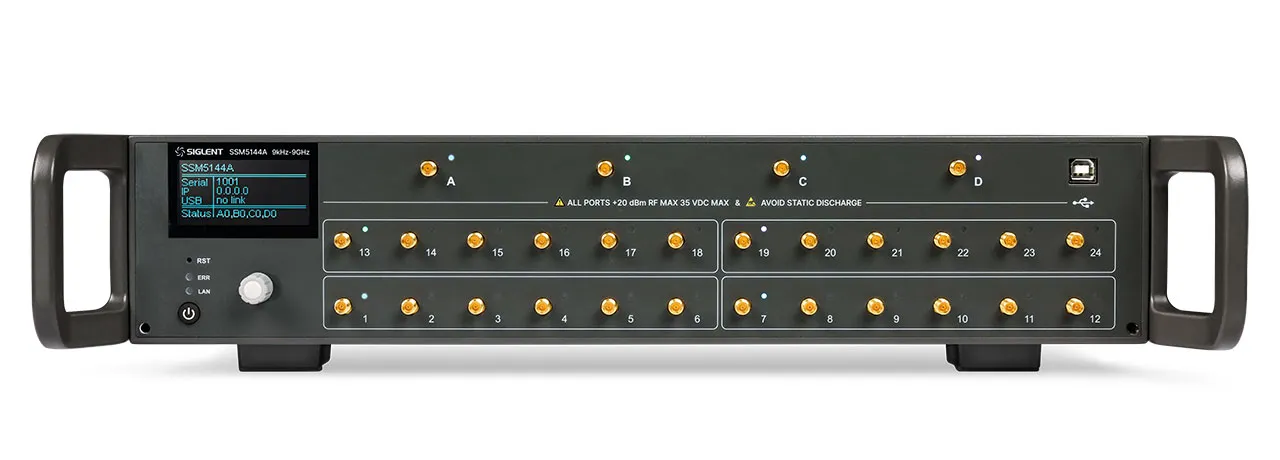 The SSM5000A series switch matrix can increase the number of test ports of network analyzer, signal source, spectrum analyzer and other test equipment. The series are with up to 4 input ports and up to 24 output ports, supporting USB, LAN, Direct Control communication modes. The Direct Control interface on the switch matrix can further expand the number of test ports and support a simplified multi-port calibration algorithm, which can greatly improve the efficiency of calibration.