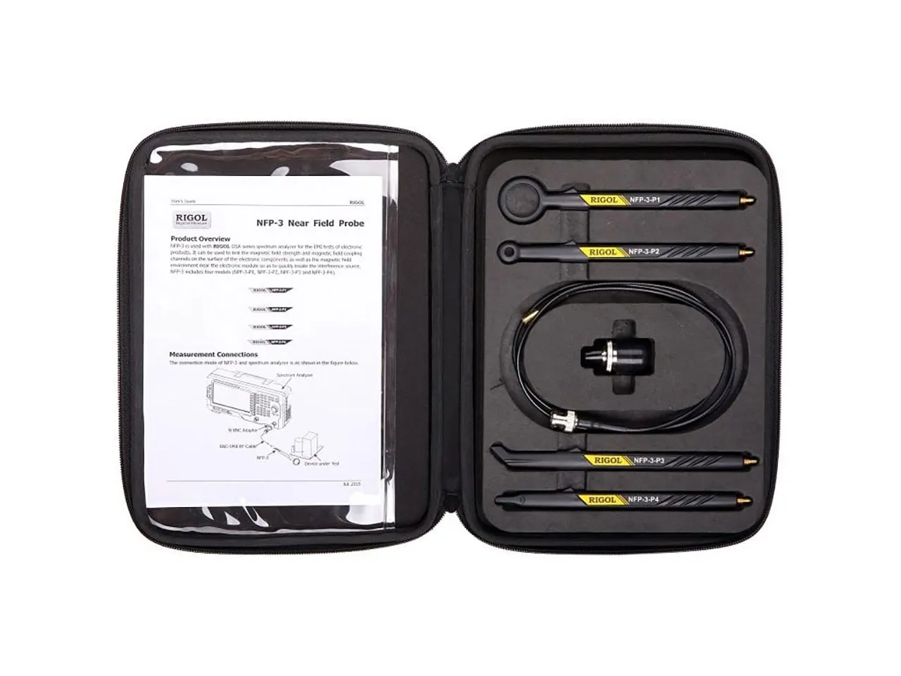 For EMI evaluations on electronic products, the Kit is used in conjunction with a Rigol DSA series spectrum analyzer. It can be used to test the magnetic field strength, magnetic field coupling channels, magnetic field environment close to the electronic module, and the magnetic field environment on the surface of the electronic components in order to swiftly identify the interference source.