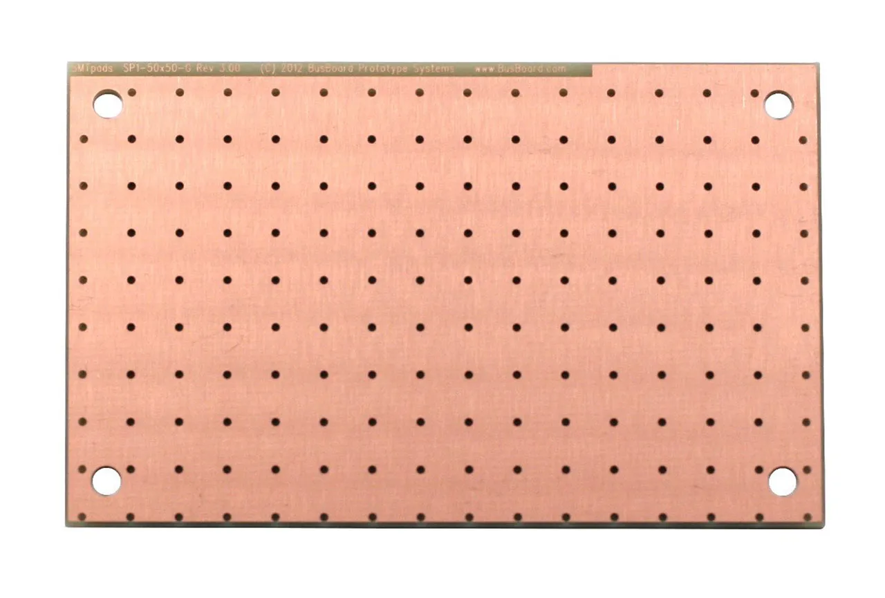 SP1-50x50-G SMTpads-Size1, 50x50mil Pads, Unplated Holes, 1/16" Thick.SMTpads is a prototyping circuit board with a grid of pads for 0402, 0603, 0805, 1206, SOT23, and other SMT parts. A grid of 42 mil square pads on 50 mil centers allows SMT components of various sizes and pitches to be mounted. Larger components can span pads. SOIC (50 mil pitch) and DIP (100 mil pitch) integrated circuits can be soldered directly to the pads without adapters. A solid ground plane on the bottom side provides an easy way to make ground connections. There are unplated holes spaced every 500 mils. To make a connection to the ground plane, just insert a wire and solder both sides.