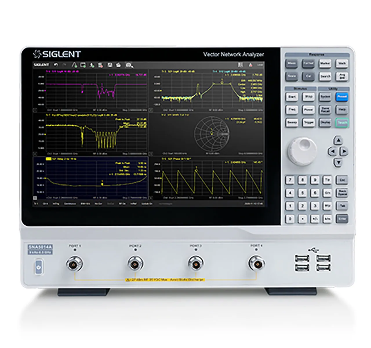 SIGLENT SNA5000A Vector Network Analyzers (VNAs) have a frequency range of 9 kHz to 4.5 GHz, with 2 ports. Designed to give you instant insight into scattering, differential, and time-domain measurements. Siglent VNAs are effective instrumentation for determining the Q-factor, bandwidth, and insertion loss filters and feature impedance conversion, movement of measurement plane, limit testing, ripple test, fixture simulation, and adapter removal/insertion adjustments. There are five sweep types: Linear-Frequency, Log-Frequency, Power-Sweep, CW-Time, and Segment-Sweep mode. SNA5000A VNAs also support scattering-parameter correction of SOLT, SOLR, TRL, Response, and Enhanced Response for increased flexibility in R&D and manufacturing applications.Key Features