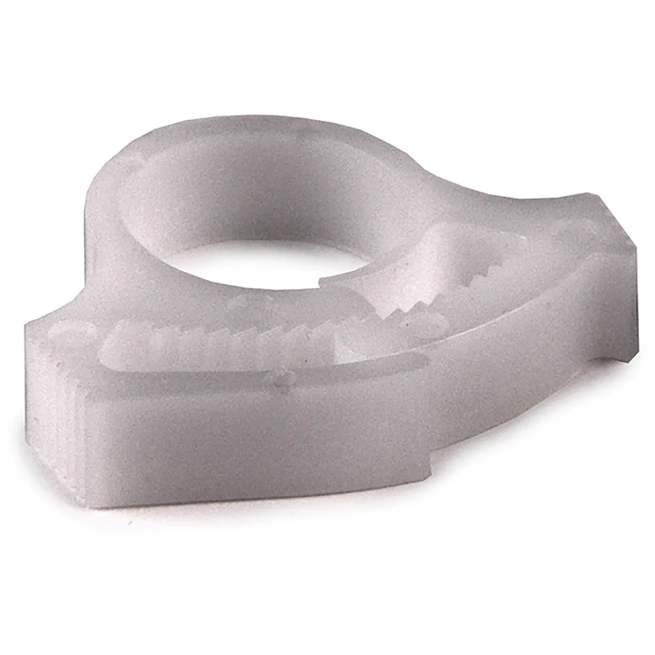 The Snapper Hose Clamp features a ratchet-style closure for reduced assembly time. It can be added after connection of the hose. Release by sliding the ratchet ends apart. These white polyacetal Snappers can be used in under-hood applications and are stable in a wide variety of chemicals including salts, bases, alcohols, ethers, detergents, gasoline, lubricating oils and greases. Custom design and color options are available based upon application and volume requirements.
