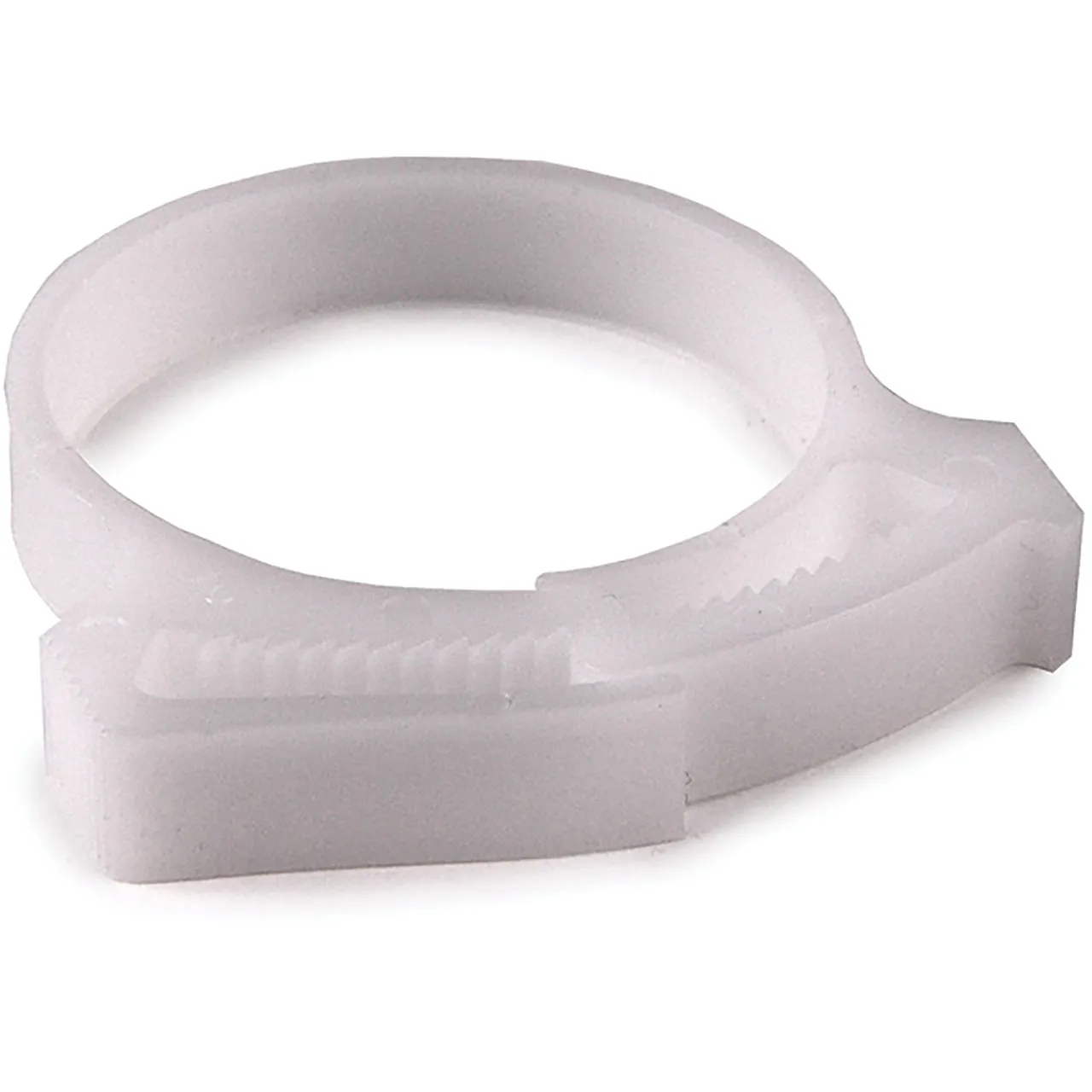 The Snapper Hose Clamp features a ratchet-style closure for reduced assembly time. It can be added after connection of the hose. Release by sliding the ratchet ends apart. These white polyacetal Snappers can be used in under-hood applications and are stable in a wide variety of chemicals including salts, bases, alcohols, ethers, detergents, gasoline, lubricating oils and greases. Custom design and color options are available based upon application and volume requirements.