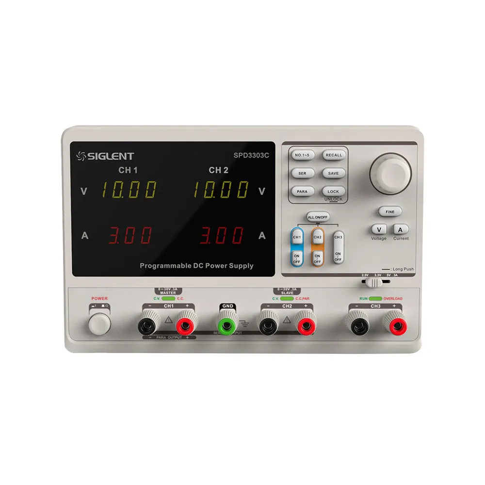 The SPD3303C is a LED display screen programmable linear DC power supply that is both, lightweight, and is multi-functional. It has three independent outputs: two sets of adjustable voltage and a fixed set of selectable voltages, 2.5V, 3.3V, and 5V. In addition, it has output short-circuit and overload protection. Total power is 195W. It possesses an independent, series / parallel output mode. The SPD3300C is a high performance-to-price price product that can be used in various types of production and research environments.Features: