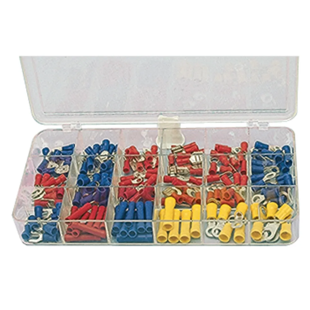 Includes 170 terminals and connectors and a clear, hinged plastic box for organization.