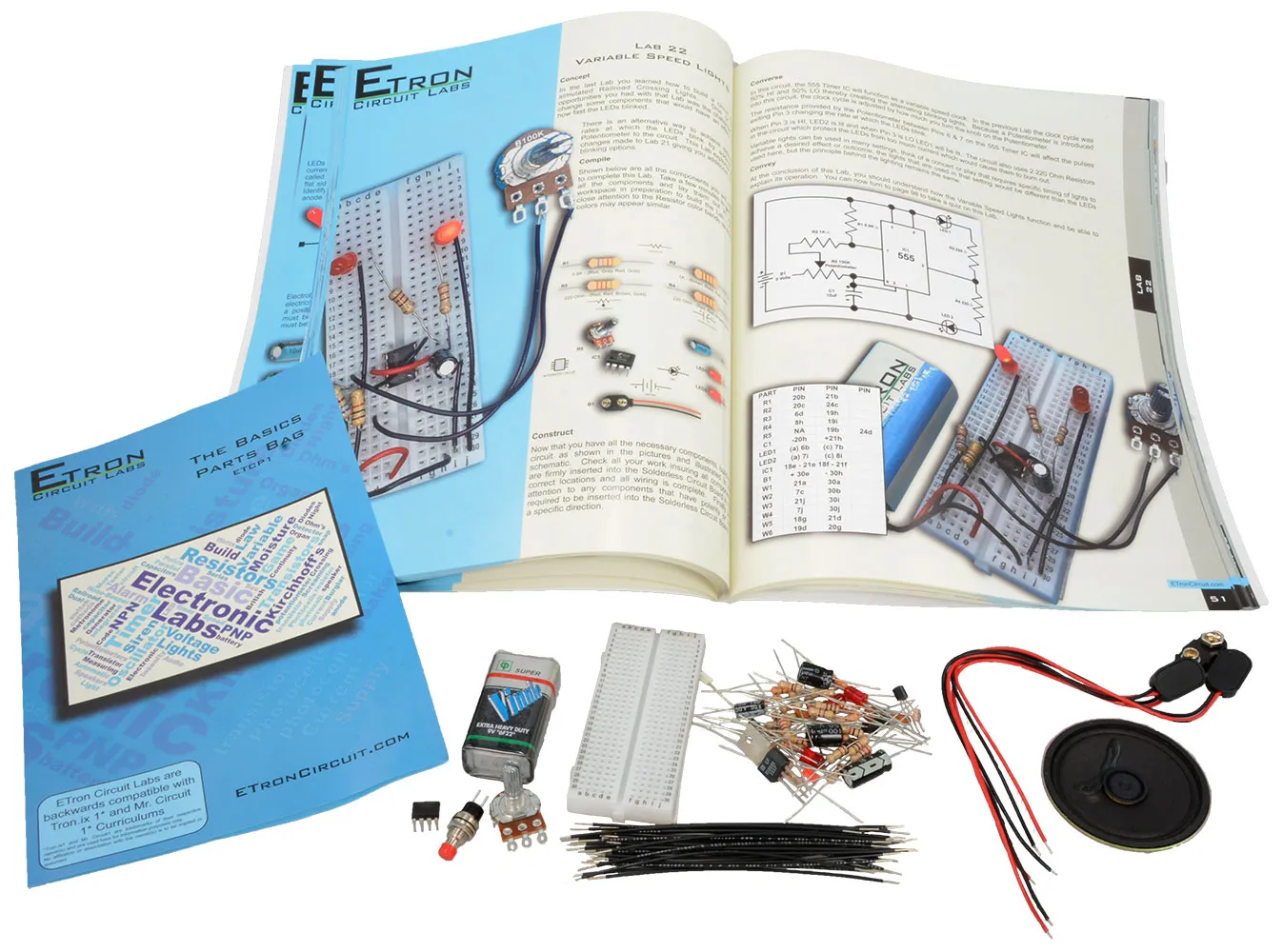 Complete Lab includes The Basics v2.0 manual (ETCM1), The Basics parts kit (ETCP1), Solderless Circuit Board (CB111) and 9-Volt Battery (SK9VB)