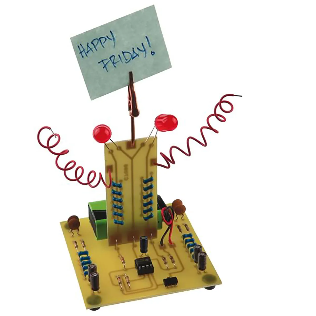Before running out the door, check your RoboNote for any important messages. Need a reminder to bring your lunch, pack your science project or that it's test day? Now your reminder notes won't go unnoticed with the help of the flashing activated RoboNote. The RoboNote uses two large and bright 10mm LEDs that alternately flash by using a 555 IC configured as a multi-vibrator. As soon as you read your note, you can remove it from its clip and switch it off to put the RoboNote to rest. Perfect for beginner student as it has 34 practice parts (besides all the active parts) to solder throughout the design of the robot's base and body. Operates on a 9V battery (not included). Uses 2 PC boards. Size of base PC board: 3.25" x 3.25" and size of body PC board 1.25" x 30". Complete with all parts, PC boards and instructions. Skill Level 1.