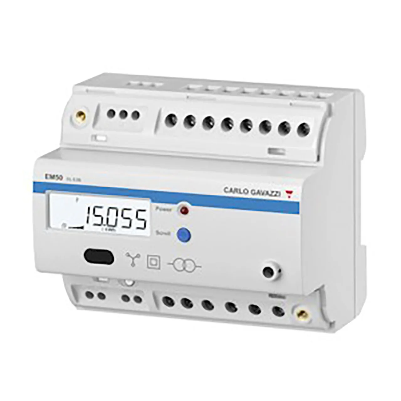 Three-phase energy analyzer for DIN-rail mounting with LCD display. It is equipped with a static output (pulse transmission), a relay output (alarm or remote control function) and Modbus RTU or BACnet MS/ TP port. EM50 manages direct voltage connection up to 600 V L-L or by means of voltage transformers. The current measurement is carried out via 333 mV current sensor..