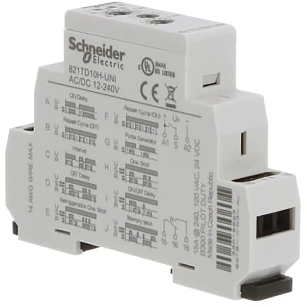Time Delay Relay, 12-240VAC/DC, 15A, SPDT, 100ms to 10 Days, 8 Time Scale, 10 Time Functions, DIN Rail Mount.