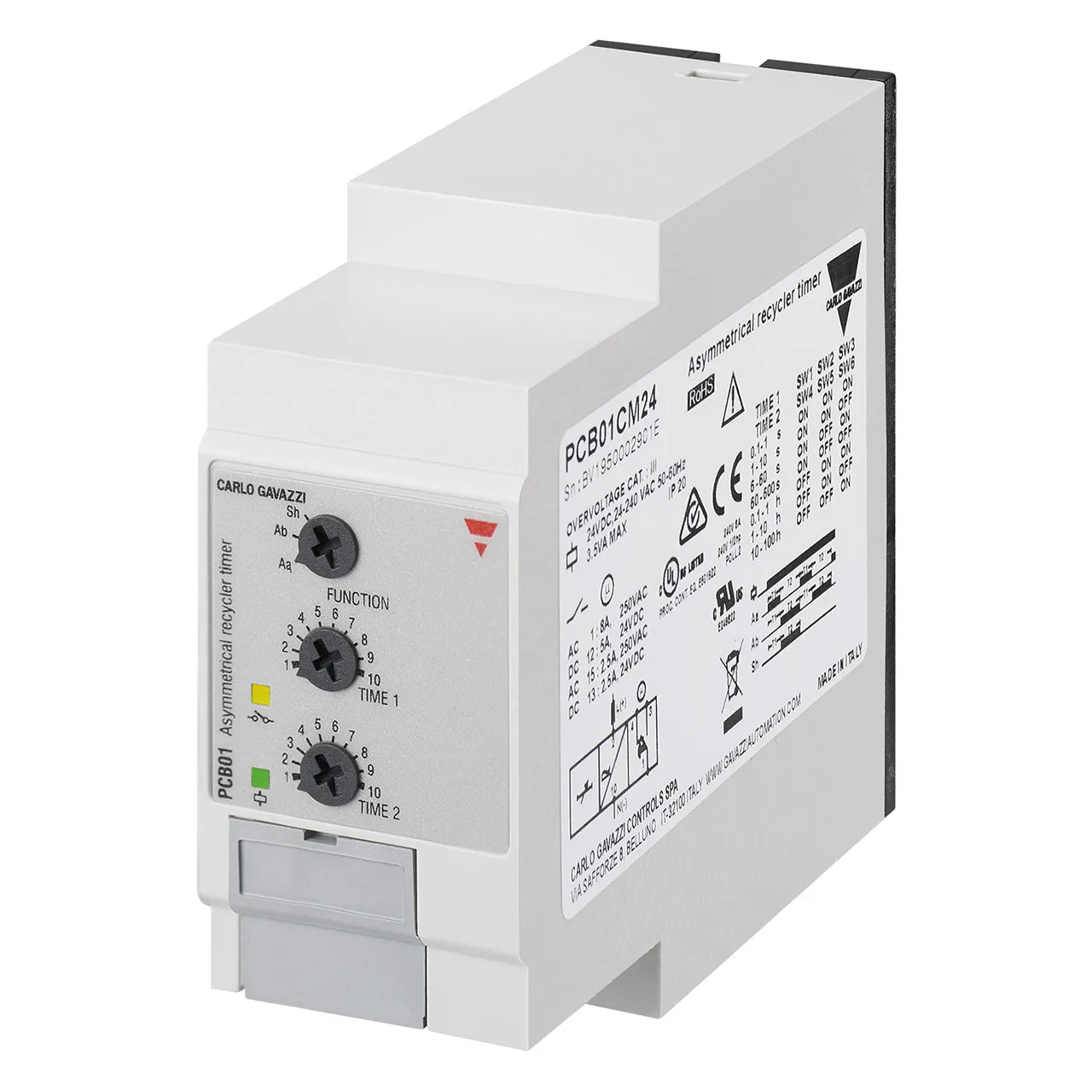 Timer Asymmetrical Recycler, Plug-in Socket mount, 36x80x94mm Euronorm housing, selectable time ranges 0,1s - 100h, Supply voltage 24-240Vac/Vdc, 8A DPDT relay output.