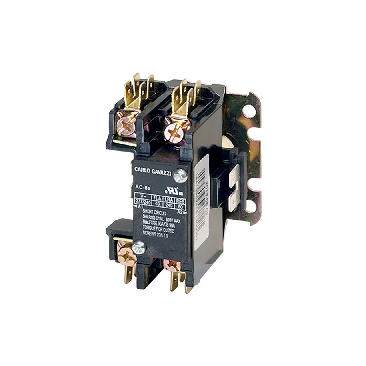 Two-pole Definite Purpose style, 32Amps rated (FLA at 240VAC) contactor with screw terminals, 24 VAC coil. One pole is being switched while the other pole is a pass through.