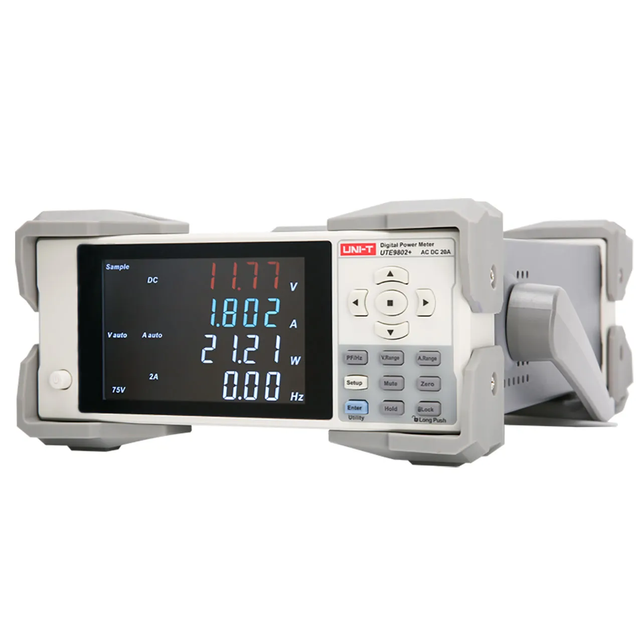 The UTE9802+ digital power meter delivers versatile AC/DC measurement capabilities with true RMS measurement for accurate power analysis across diverse applications including AC/DC charging piles, power batteries, and home appliance testing. Featuring a voltage range of 3.0V to 700V and current range of 0.5mA to 20A, this instrument provides comprehensive power measurement with limit setting for current and power parameters.