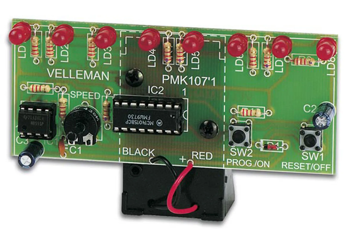 The Velleman MK107 DIY minikit circuit utilizes a 555 timer IC and a dual 4-bit shift register IC to create an 8 LED running light. In the primary mode, the LEDs light up in sequence from one side of the board to the other. You can push the program button to change the running light effect, and use the potentiometer to adjust the speed. The circuit is powered by a 9V battery and the battery holder is included with the minikit.Features