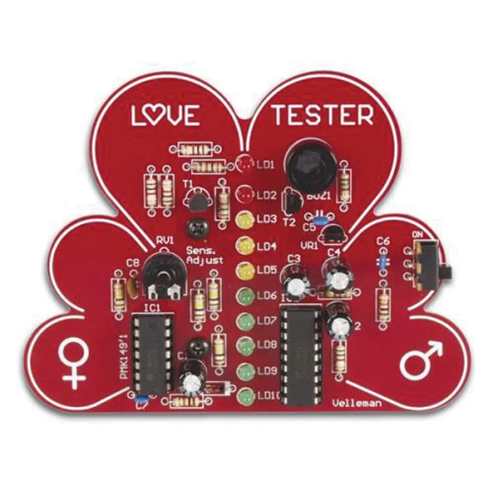 The MK149 Love Tester self-assembly electronic kit is a fun way to test your love life. Each partner holds one end of the PCB, then they join hands, and watch the meter go...Read our review of this kit on the Jameco Workshop page.