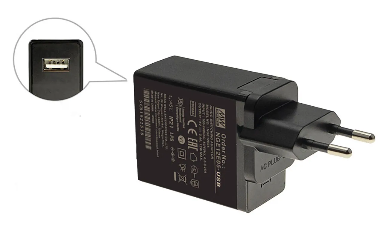 NGE12 is a highly reliable 12W wall-mounted single-output green adapter series which is compact and easy for carry. NGE12 is a class II power unit (no FG), accepting a wide input range from 80 VAC to 264 VAC so it can satisfy the demands for various types of electrical devices.