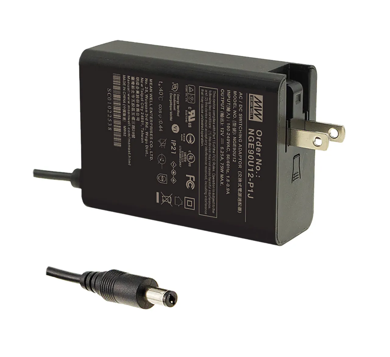NGE90 is a highly reliable 90W wall-mounted single-output green adapter series which is compact and easy for carry. This product supports five types of interchangeable AC plug clips (European, USA, UK, Australia, and China tyle) that makes it very suitable for travel use. NGE90 is a class II power unit (no FG), accepting a wide input range from 80 VAC to 264 VAC so it can satisfy the demands for various types of electrical devices.